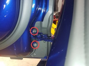 Install the bolts (x2) that attach the LH lower rear door hinge to the door