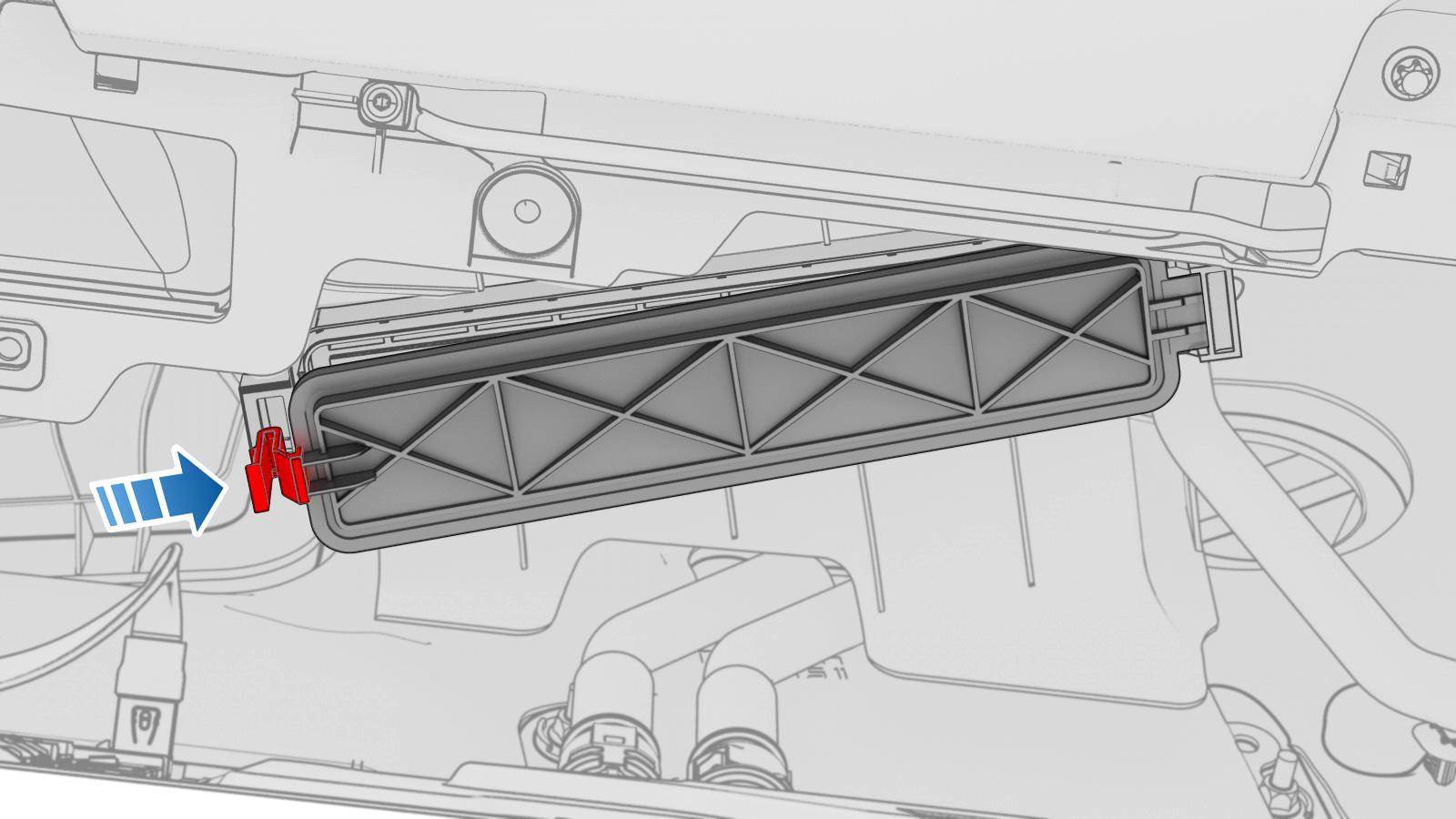 - Release the cabin filter door lock and then remove the door from the vehicle.