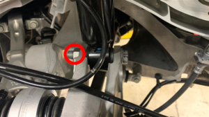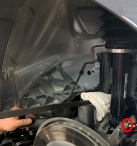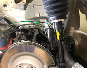 - Pull the LH rear knuckle away from the body, move the top end of the LH rear active damper up onto the studs, and them move the bottom end of the damper out to the knuckle.