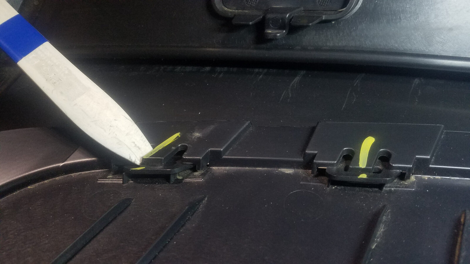 tabs (x10) that attach the tow hitch cover to the rear fascia assembly, and then remove