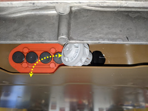 - Move the flood port in through the relief in front of the HV battery breathers, and then to the right.