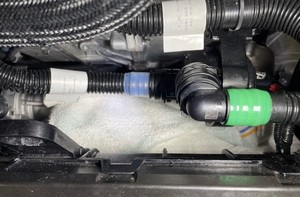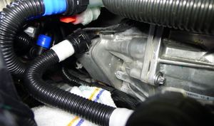- Release the clip, disconnect the supermanifold to offboard powertrain pump hose from the powertrain coolant pump, then immediately plug both fittings.