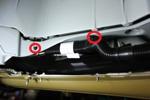 - Release the clips (x2) that attach the power conversion system coolant return to LH sill hose to the body.