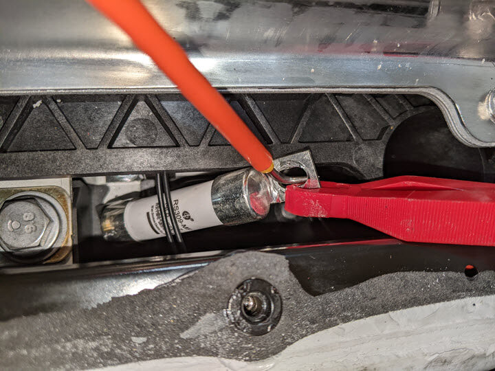 - Use the fuse puller to install the electrical harness terminal onto the mounting stud.