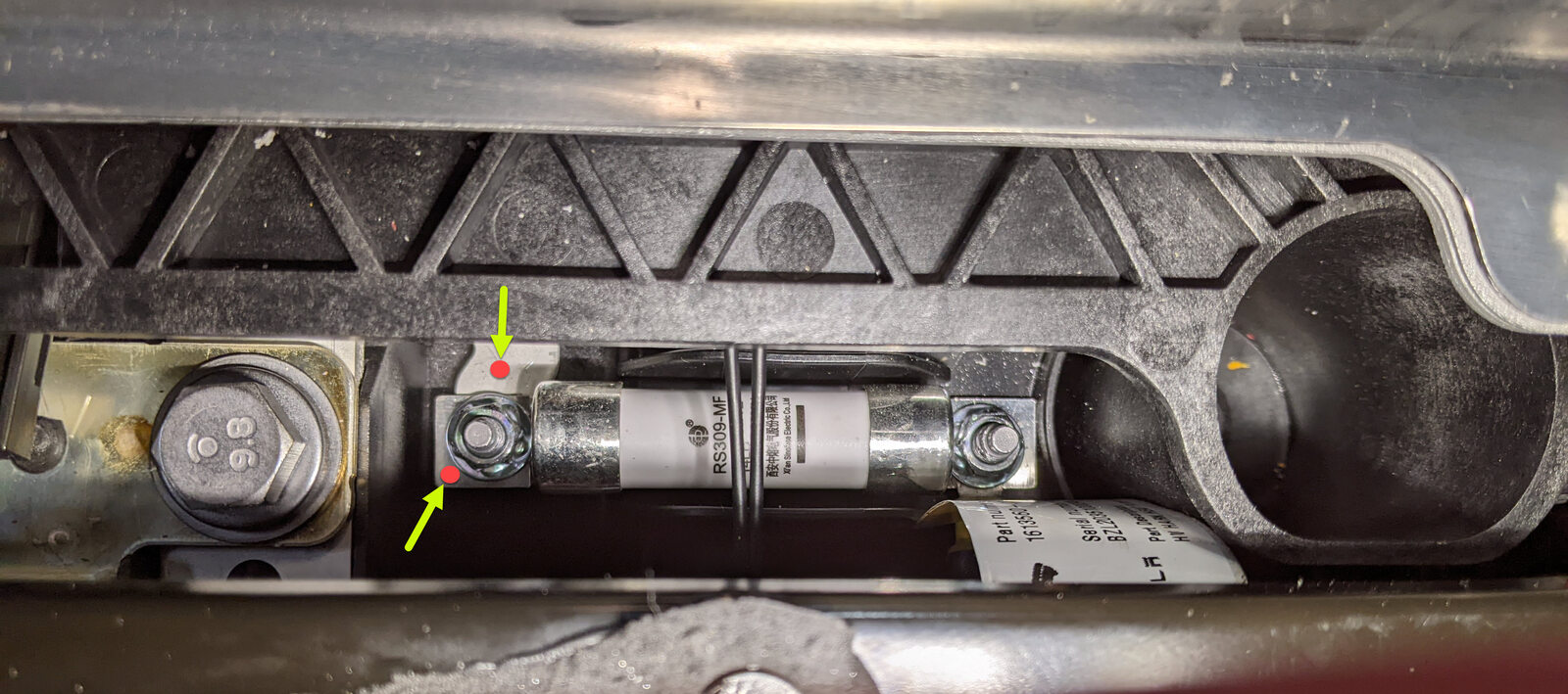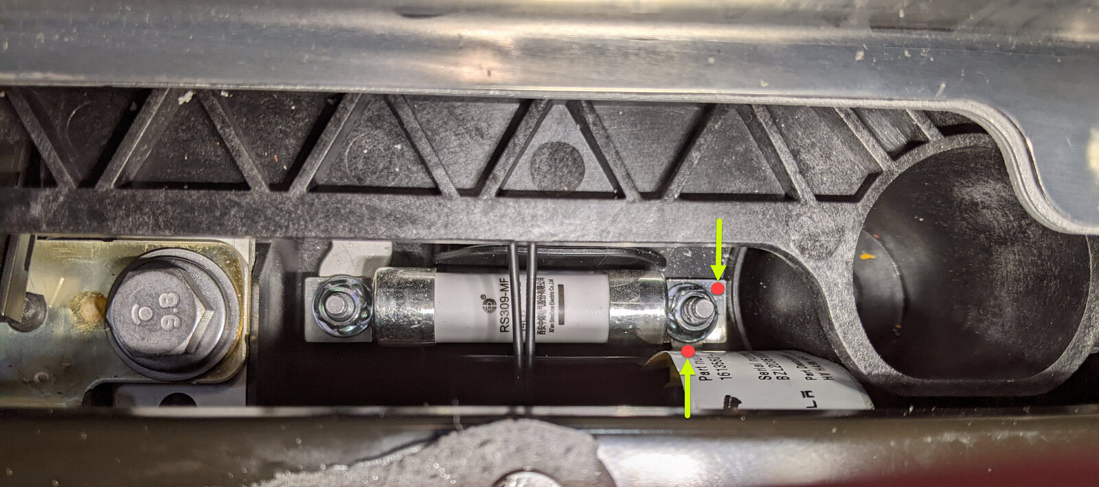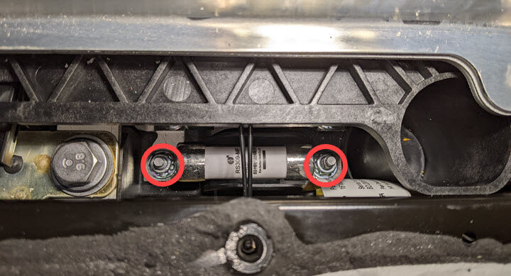 - Remove the nuts (x2) that attach the A/C compressor fuse to the mounting studs.