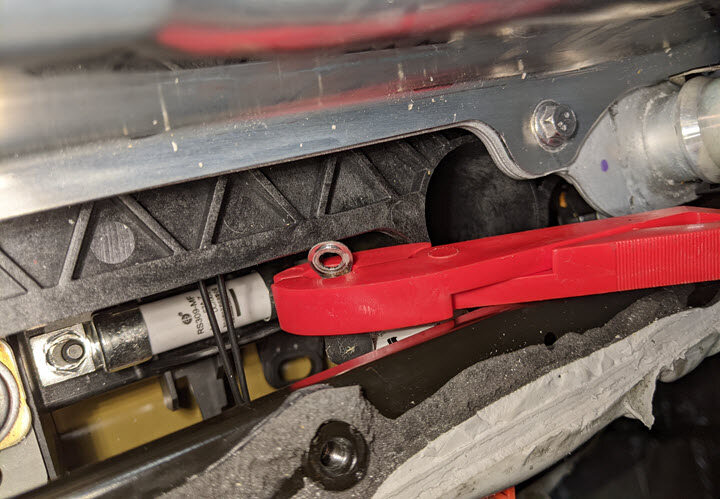 - Use the HV insulated pick together with the fuse puller to carefully move the A/C compressor fuse out from under the electrical harness wires, and out of the front bay of the HV battery.