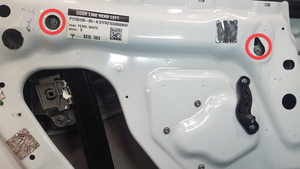 - Retire los tapones (2 uds.) que cubren las aberturas de la puerta trasera izquierda para acceder a las guías de montaje del regulador de la puerta trasera izquierda.