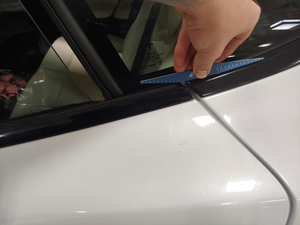 - Aplique cinta adhesiva al tirador exterior de la puerta trasera izquierda y, a continuación, corte con cuidado alrededor del tirador de la puerta para proteger el tirador y la puerta.