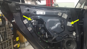 - Baje parcialmente el cristal de la puerta trasera izquierda para acceder a la abrazadera del aislador del regulador situado más adelante.