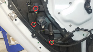 Retire los tornillos (3 uds.) que fijan el motor del regulador de la ventanilla trasera izquierda a la puerta.