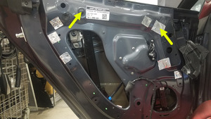 - Coloque el tapón y el parche de butilo que cubren las tuercas de montaje superiores del regulador de la puerta trasera izquierda.