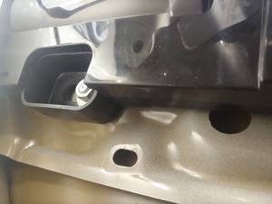 Apriete las tuercas de fijación (2 uds.) del regulador trasero izquierdo inferior.