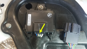 - Instale parcialmente el regulador de la ventanilla trasera izquierda en la abertura de la puerta con suficiente holgura para acceder al conector eléctrico del mazo de cables del motor.