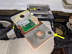 - Gire la derivación de la batería de alta tensión hacia la izquierda sobre el pasador guía hasta que la derivación salga de debajo de la barra colectora y, a continuación, levante la derivación en vertical para sacarla del pasador guía.