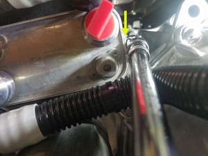 Retire el clip que sujeta la manguera de retorno de PT al intercambiador de calor de la unidad de tracción trasera.