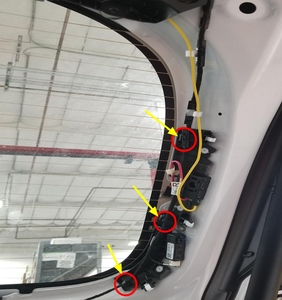 - Fije el mazo de cables del sintonizador del portón trasero a los clips de sujeción del soporte en bruto de la luz de freno superior (4 uds.).
