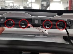 - Suelte el mazo de cables del sintonizador del portón trasero de los clips de sujeción del soporte en bruto de la luz de freno superior (4 uds.).
