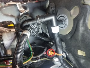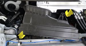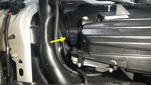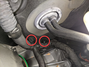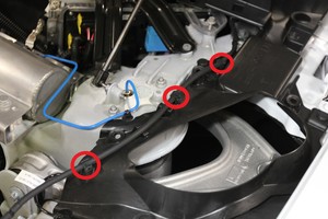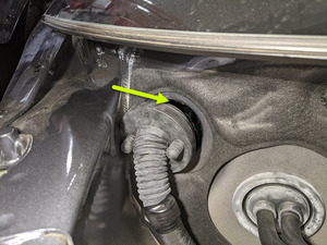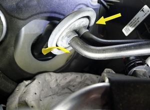 Suelte la boquilla de la manguera del lavaparabrisas situada junto a la cubierta izquierda de la torre de amortiguadores