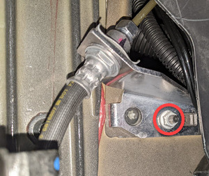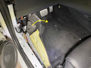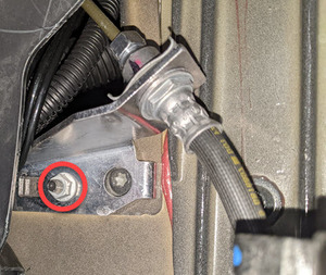 Instale la toma de tierra del mazo de cables del maletero delantero en la zona de los pies izquierda