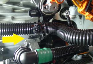 Suelte el clip que sujeta el Supercolector con la manguera de suministro de la bomba de la batería de la batería de baja tensión
