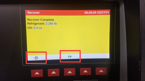 NotaConecte los acopladores al vehículo. Anote la cantidad de refrigerante y aceite recuperados. Marque el nivel de aceite de la botella de drenaje de aceite (use un trozo de cinta adhesiva para marcar el nivel del líquido). Abra los acopladores girando en el sentido de las agujas del reloj. Use Menú principal > Recuperar > Verificar conexión de la manguera. La máquina emitirá un sonido una vez finalizado el proceso. El vehículo puede dejarse desatendido. Anote o imprima la cantidad de refrigerante y aceite recuperados. El refrigerante recuperado debe ser de aproximadamente 1,02 kg (2,24 lb). El aceite recuperado debe ser de aproximadamente 8,87 ml (0,3 oz). Si el nivel de aceite drenado supera los 30 ml (1,01 oz), consulte la tabla de pérdidas de aceite drenado https://toolbox.teslamotors.com/articles/353700