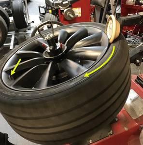 NotaAsegúrese de colocar el sensor TPMS en el lado contrario del brazo de la máquina de neumáticos. Si el neumático lleva una flecha de dirección de rotación hacia fuera o hacia el exterior, asegúrese de que esté bien orientado