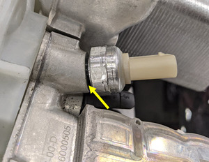 - Si la junta tórica del sensor de temperatura del lado de baja presión parece quedarse atrapada o ya no se desliza en el bisel, deténgase y desenrosque el sensor hasta que la junta tórica deje de quedar atrapada.