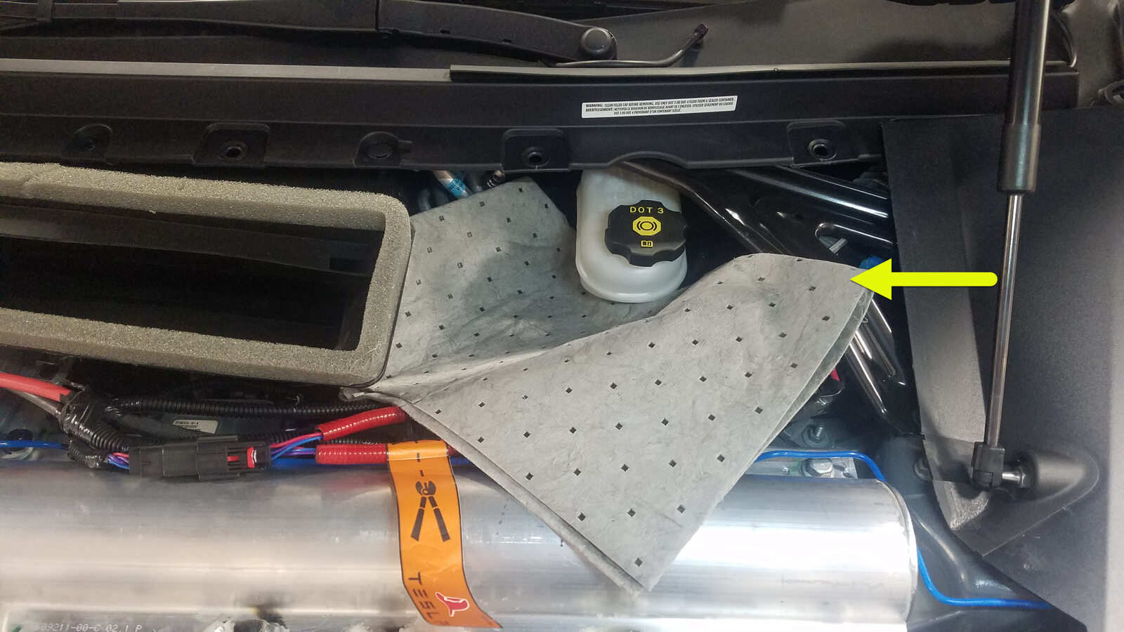 - Remove the absorbent material from underneath the master cylinder and reservoir area.