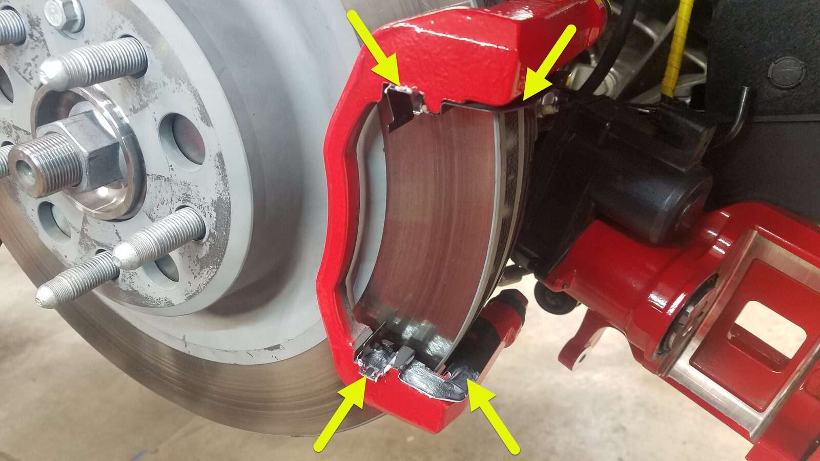 brake caliper lubricant to both brake pad's guide pin (x2) and piston (x2) contact