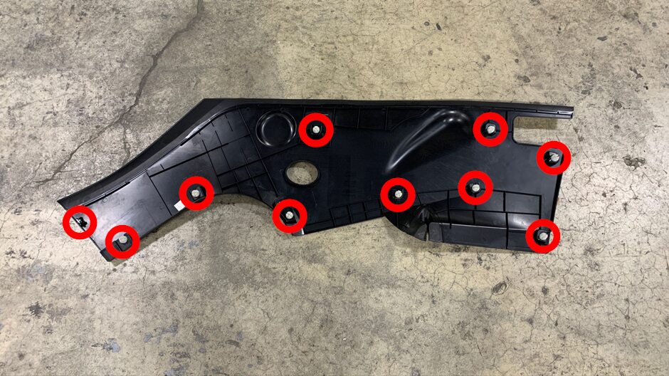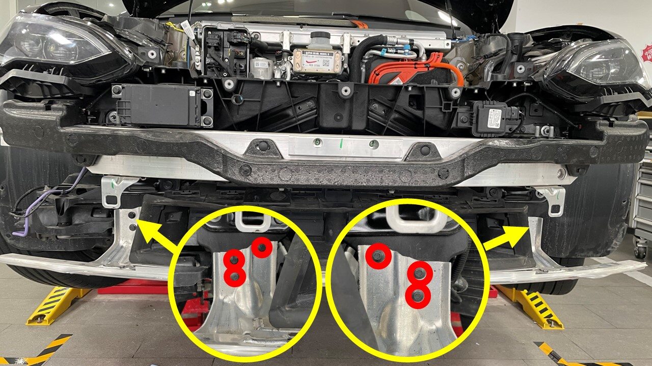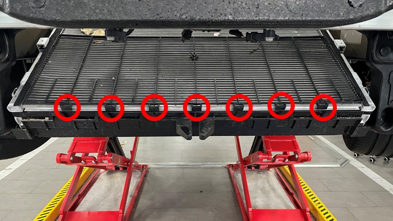 Nota8x bolts, 10mm, 6 Nm, 2x clips, 2x datums, Insert valance datums into aero shield holes, Do not remove 3x middle bolts