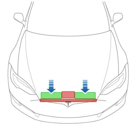 NotaPress firmly in green highlighted areas (see image), Damage may result from pressure elsewhere on hood