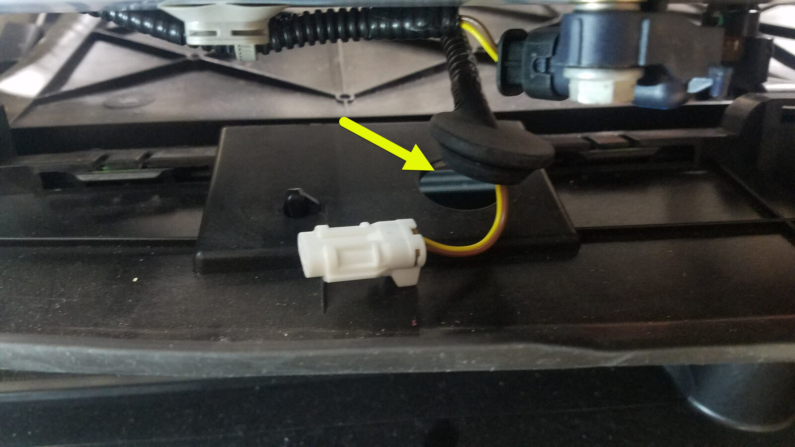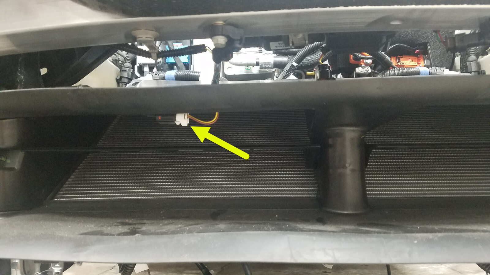 Disconnect ambient temperature sensor connector and route through grommet opening in shroud