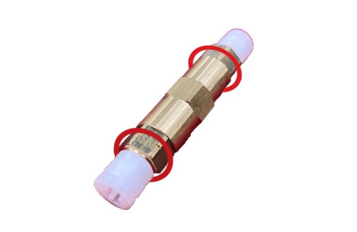 - Inserte los tubos de aire completamente en el racor de cada lado de la unión de metal VOSS y, a continuación, tire ligeramente de los tubos para comprobar que están bien sujetos.