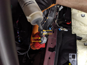 - Aplique 2 gotas de Penetrox A-13 de aproximadamente 5 mm de diámetro a cada lado del orificio de ambos cables de las barras colectoras y, a continuación, distribúyalo uniformemente hasta asegurarse de que la superficie de contacto esté completamente cubierta.