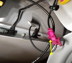 - Enchufe el conector de la cámara de visión trasera en el mazo de cables derecho del portón trasero.