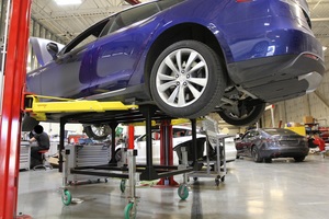 - Con la ayuda de otra persona, baje el vehículo hasta justo por encima de la mesa de baterías, suba y baje las ruedas de la mesa según sea necesario para nivelar la mesa con la batería de alta tensión y, a continuación, baje el vehículo sobre la mesa.