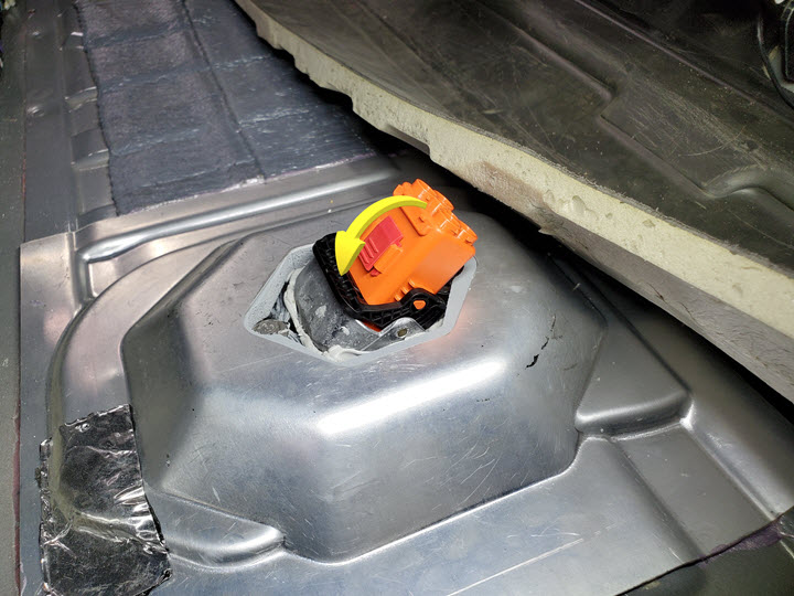 - Conecte el mazo de cables al conector de baja tensión de la batería de alta tensión y, a continuación, empuje la pestaña de bloqueo roja hacia dentro.
