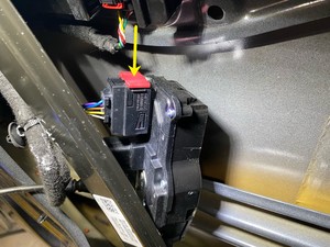 - Suelte el bloqueo del conector y, a continuación, desconecte el conector eléctrico del conjunto del cierre de la puerta delantera izquierda.