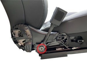 Coloque la hebilla del asiento del conductor en el vehículo y, a continuación, coloque un perno nuevo para sujetar la hebilla a la guía del asiento.