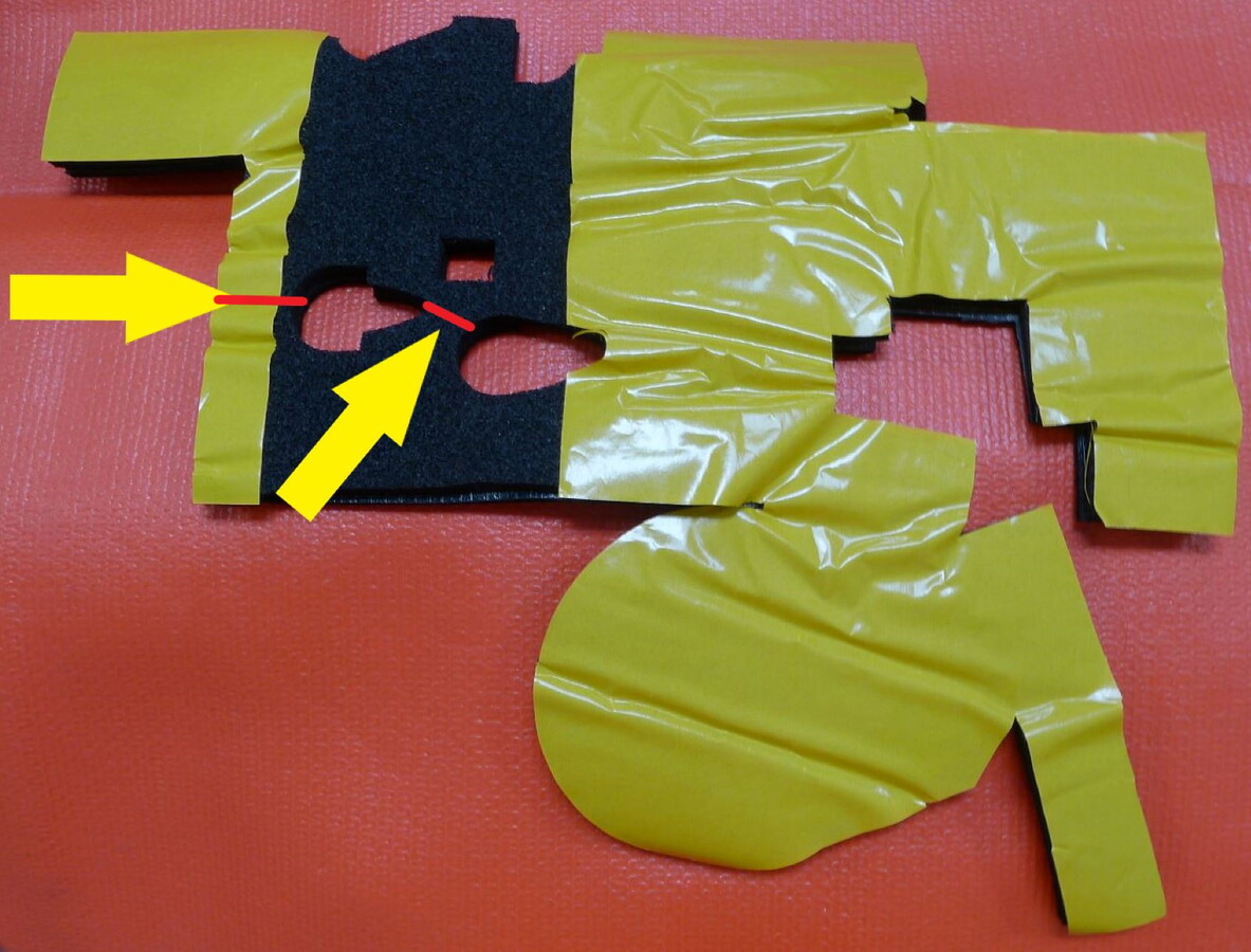 Realice 2 cortes en la manta acústica, como indican las líneas rojas, de modo que la manta encaje alrededor de los tubos de aire acondicionado.