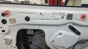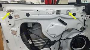- Retire los parches de butilo que cubren las aberturas de la puerta que acceden a las tuercas de montaje del regulador superior delantero izquierdo.