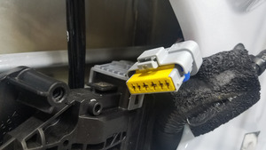 - Enchufe el conector eléctrico del controlador del tirador de la puerta delantera izquierda y, a continuación, acople el bloqueo del conector.