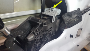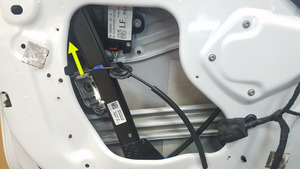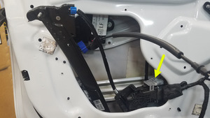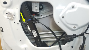 - Pliegue y retire parcialmente el regulador de la ventanilla delantera izquierda a través de la abertura de la puerta con suficiente holgura para acceder al conector del mazo de cables del motor