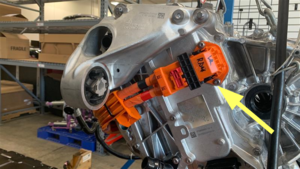 - Deslice la pestaña de bloqueo del conector rojo, abra la palanca de liberación negra y, a continuación, desconecte del cabezal de alta tensión del inversor de la unidad de tracción el mazo de cables de alta tensión de la unidad de tracción.
