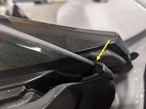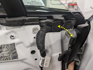 Vuelva a colocar la esquina superior de la junta de la puerta delantera izquierda en su posición y, a continuación, apriete el clip que fija la junta al conjunto de la puerta.