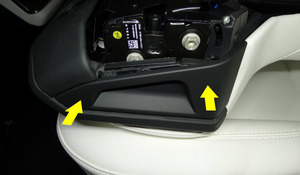 - Coloque la cubierta lateral del respaldo del asiento izquierdo de la 2.ª fila en el respaldo del asiento izquierdo de la 2.ª fila y, a continuación, coloque los clips (2 uds.) que fijan la cubierta al respaldo del asiento.