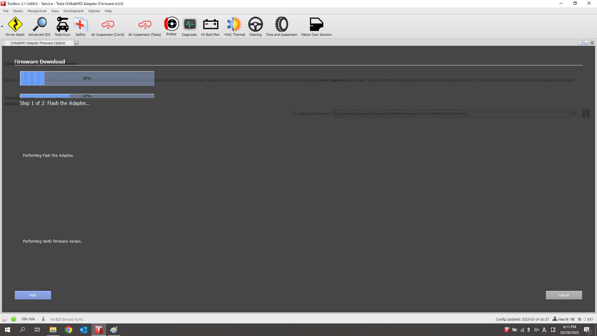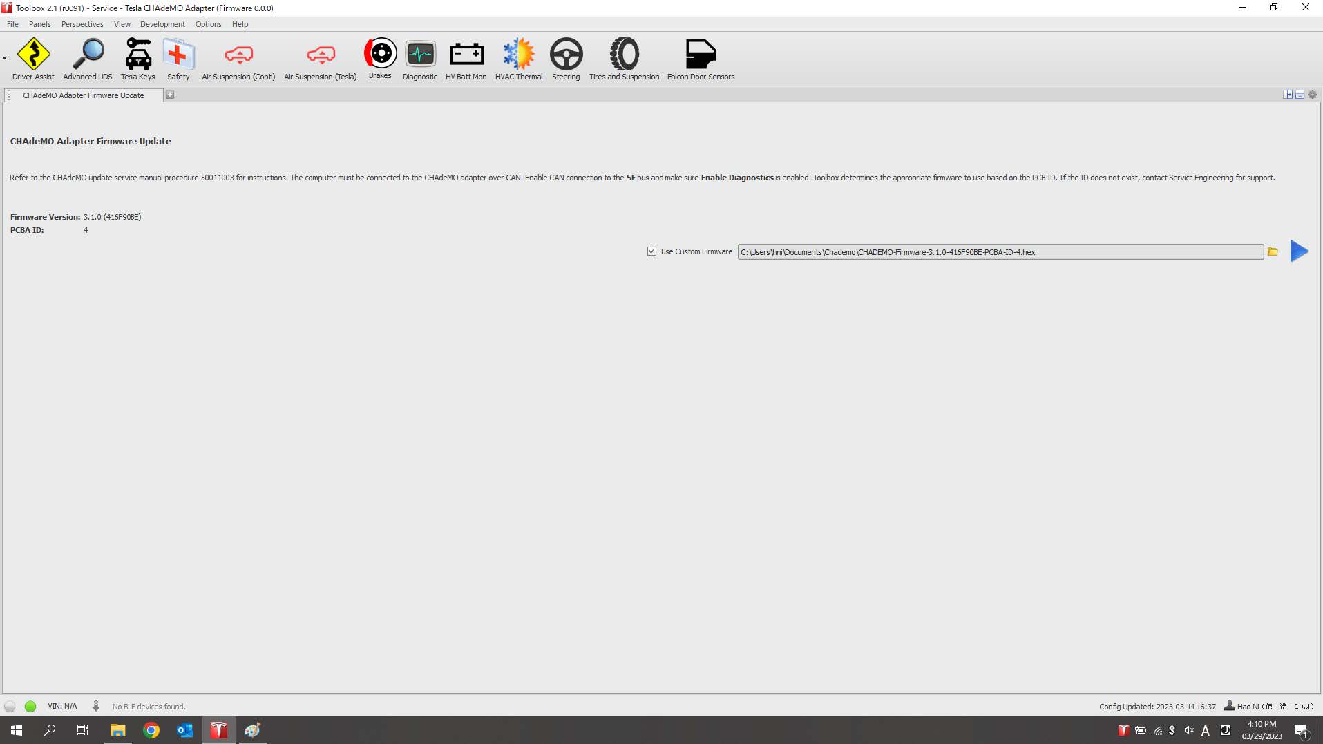 En la ventana que se abre, en el menú desplegable Vehículo, seleccione Adaptador CHAdeMO de Tesla; en el menú desplegable Bus, seleccione SE, seleccione Activar diagnóstico y, a continuación, haga clic en Activar.