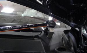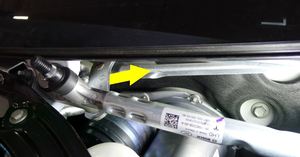 Suelte la boquilla de la manguera del lavaparabrisas situada junto a la cubierta izquierda de la torre de amortiguadores