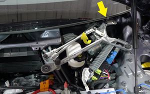NotaEn Controles > Servicio > Limpiaparabrisas en modo servicio. Si el módulo del limpiaparabrisas no está en Modo de servicio, el brazo de pivote derecho no se separará del travesaño del soporte en V durante el desmontaje