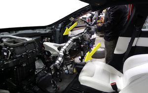 Nota2 referencias, 2 clips con muelle. Coloque el airbag del conductor en el volante tipo yugo. Alinee las referencias con los clips. Presione un lado del airbag hasta que el clip quede completamente asentado y, a continuación, repita en el otro lado. Oirá un clic. Realice una prueba de tracción en cada lado del conjunto del airbag del conductor. Confirme que la separación y el espacio entre el conjunto del airbag del conductor y el volante tipo yugo son simétricos